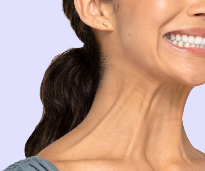The platysma muscle is a thin muscle that covers the neck and extends over the lower face. When this muscle is contracted it can cause the appearance of bands on the neck, which can also create a less defined jawline.